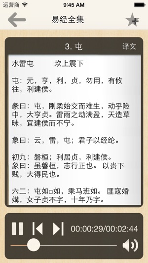 Appstore上最全的易经(周易)有声读物,离线收听, 不耗流量,速度快,不用联网一样可以收听和浏览,无广告,无插件. 支持后台播放,方便、省电,支持进度保存 支持原文、译文显示 《易经》也称《周易》或《易》,是中国传统思想文化中自然哲学与伦理实践的根源,对中国文化产生了巨大的影响。据说是由伏羲氏与周文王(姬昌)根据《河图》、《洛书》演绎并加以总结概括而来(同时产生了易经八卦图),是华夏五千年智慧与文化的结晶,被誉为“群经之首,大道之源”。在古代是帝王之学,政治家、军事家、商家的必修之术。从本质上来讲,《易经》是一本关于变化之书,长期被“卜筮”利用。 易经由卦符、卦名、卦辞、爻题、爻…