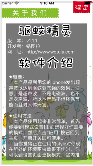 *概要: 本产品是利用您的iphone发出超声波以达到驱蚊驱苍蝇的效果,注意,是超声波,不是电磁波,也不是次声波,所以本产品不但环保节能而且对人体无害。 *使用方法: 本产品使用起来非常简单,首先你要到设置里面选择好你需要的模式,然后点击“确定”按钮回到主页,开启开关即可使用。 当你觉得正在使用的style对你现在所处的环境驱虫效果不佳时,你可以到设置页面更换模式,室内推荐使用合成式,室外推荐使用蝙蝠式。 *功能描述: 超声波只能干扰蚊子、苍蝇等飞虫活动,达到驱赶的作用,不能直接杀死它们。 本产品在研发期间,用了两种昆虫进行实验:蚊子和苍蝇。通过一次次的失败,多次反复不停的测试,最终研发出…