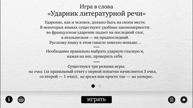 Игра в слова «Ударник литературной речи». Игра представляет собой набор из 120 карточек. На каждой карточке приведено общеупотребимое слово русского языка, в котором чаще всего неправильно ставят ударение. Необходимо правильно выбрать ударную гласную и, нажав на нее, проверить себя. Если вам понра…