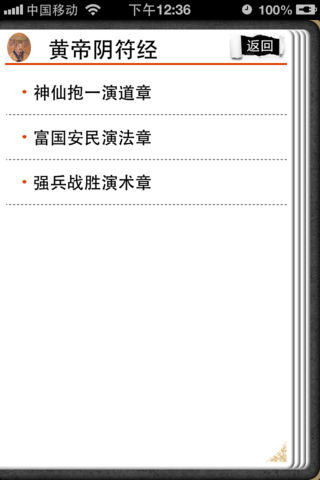 《黄帝阴符经,简称《阴符经》。作者与成书年代不详。黄帝为假托之名。一说成书于北朝拓跋魏时期。一卷。传本有《神仙抱一演道章》、《富国安民演法章》、《强兵战胜演术章》之上、中、下三篇者。如宋·夏元鼎《黄帝阴符经讲义图说》全以内丹法释之。又《悟真篇》:“阴符宝字逾三百,道德灵文止五千。”也有以纵横家、兵家之意注释者。本书言简意赅,具有朴素的唯物主义倾向,历来为学者所重视。 此书论述深刻,在中国古代的哲学和兵学中都占有一定地位。 全书只有300多字,共分三章。 神仙抱一演道章——论天道与人事的关系 富国安民演法章——论天道的法则 强兵战胜演术章——论用兵理论
