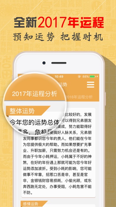 八字测算命理大师,随身查看运势运程。最新2017年运势分析!周易占卜测算,流年财运事业感情走向,最专业八字排盘应用。 最好的八字算命应用!八字排盘是中国人民传统文化的结晶,经历几千年的岁月而沉淀下来的民族精华,具有独特的神奇的未来预测功能。八字排盘提供精准算命,为您通晓未来,让你为接下来的未来做好充分的准备。 【八字排盘】 通过生辰八字组合出你的先天的命局,详细的命盘解说,配合阴阳五行,精准分析你的未来发展趋势,让你把握大运之年,提升事业、爱情、财运等运势。 最新2017年运势分析,提前预测分析你的运程,掌握最新运势走向,为未来提前做准备,让你始终快人一步,准确把握机遇,创造属于你未来。 自己的命运自己掌握,可是如果连自己的命理运势都不知道,你又该如何改变命运呢? 【主要功能】 1、八字算命:国内著名命理老师亲自指导,免费看排盘,周易占卜测算,为您专业提供命理信息; 2、运程分析:大运年表、流年运程为您分析一生运程起伏,流年趋吉避凶。十神、命宫详解让您知晓先天运势、命运的主轴、行运的源头。 3、婚恋配对:看桃花,定姻缘,帮你找到身边的那个TA; 4、命主分析:性格、事业、星座分析全面独到,精确预测您人生的贫贱富贵,让您更了解自己。 5、健康养生:提供专业养生要点,为您调整饮食和生活起居,助您保持健康。 【应用特色】 〖简洁易用〗国内著名命理老师亲自指导,打造最简洁易用的八字组盘解盘命理应用。 〖专业免费〗免费看排盘分析,提供八字干支、十神、五行、大运年等专业命理信息。 〖流年大运]〗大运年表、流年运势等全面分析你的一生运程起伏,让你流年趋吉避凶。 〖命宫详解〗命宫详解让你了解流年运程、知晓先天运势、命运的主轴、行运的源头。 〖分析全面〗事业、婚姻、财运、健康等讲解全面独到,精确预测分析你的人生运势。 〖开运转运〗提供各种开运转运方法,方方面面、随时随地避煞转运,轻松度过难关。 八字排盘流月分析: ¥18/月 订购八字排盘流月分析可以通过itunes账户的信用卡直接付费。如果当前订购周期(一个月)结束前24小时内未取消续订,我们将会自动为您续订下一周期的八字排盘流月分析。在订购有效期内,无法取消。订购成功后,可在“账户设置”中管理自己的订购服务。 【联系我们】 我们始终把用户的心身放在首位 通过以下方式随时关注和联系我们,让我们共同打造专业的命理应用 官方微信:lingjimiaosuan 官方网站:m.linghit.com