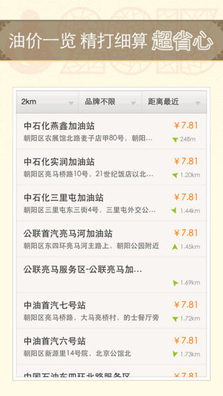 ☞ 收录了全国11万个加油站 ☞ 提供油价实时查询 →▲△功能特点△▲← 1.轻巧:快速、简单、实用的迷你型应用。 2.定位:精准定位,周边油站一目了然。 3.查询:实时油价,每日更新 4.地图:3D地图(比传统图片地图)更省流量、加载更快。 →▲△关于△▲← 该App 由[查周边] 团队荣誉出品。拥有近10年的地理技术团队,与油老婆网通力合作,诚意为您献上[周边美食]产品。