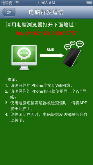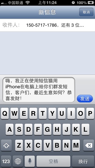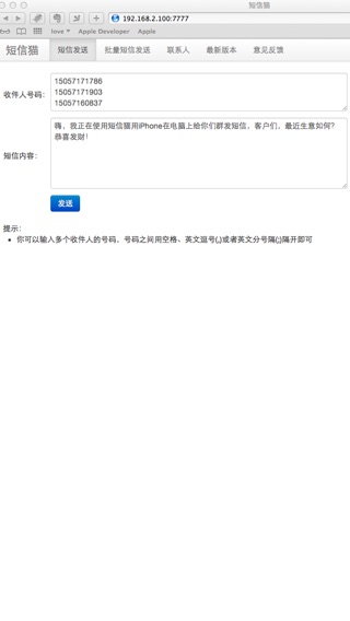 短信猫让你的iPhone成为一个短信猫,让你在电脑、手机、pad等设备上群发短信。软件自动将短信及收件人传递到您的iPhone上,轻松实现电脑发短信。 当你需要向客户发送短信时,只需在电脑上拥有客户手机号码,即可向客户批量发送消息。短信猫是你开拓客户关系、进行短信营销推广的必备工具。不但支持单条群发发送,且支持通过txt或csv文件批量群发。主要功能如下: 1、手机上群发短信 1、电脑上输入号码及短信内容,进行短信群发。 2、电脑上选择包含短信联系人号码的文件,输入短信内容,批量群发短信。 3、电脑上浏览手机通讯录功能