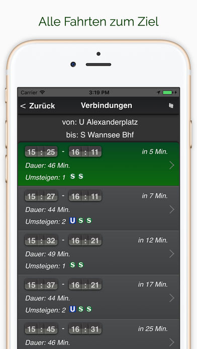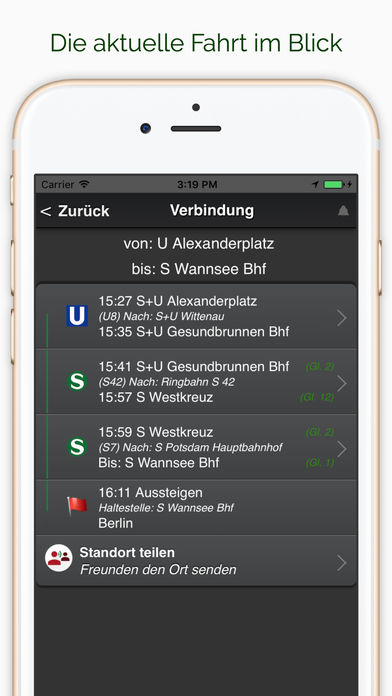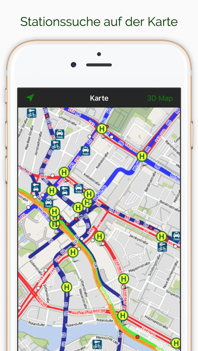 Alle wichtigsten Städte in Deutschland einer einzigen Fahrplan-App: Berlin, Bonn, Bremen, Dresden, Düsseldorf, Frankfurt a.M., Hamburg, Hannover, Kiel, Köln, Leipzig, München, Nürnberg, Stuttgart, Ulm und Ruhrgebiet. Sowie folgende weitere Städte: London, Sydney, Wien und Zürich. Die Grundidee beim A+ Deutschland Fahrplan Premium ist einfach: Die App erkennt automatisch die Stadt in der Sie sich befinden und stellt sich auf das lokale Verkehrssystem der Stadt ein (bei eingeschalteten GPS - ohne erfolgt eine manuelle Auswahl). Alle Favoriten werden für diese Stadt gespeichert. Wechseln Sie die Stadt, wird dies automatisch erkannt. Fahren Sie z.B. von Berlin nach Frankfurt, erhalten Sie in Berlin ihre Berliner Favoriten und in Frankfurt die Frankfurter Favoriten. Sobald Sie in Frankfurt sind, stellt sich die App automatisch auf das Frankfurter Nahverkehrsnetz ein. Der A+ Deutschland Fahrplan Premium zeigt Ihnen stets alle Haltestellen in der Nähe an, egal in welcher Stadt Sie sind! Mit dem Take me Home Knopf gelangen Sie so mit einem Knopfdruck von jeder Ecke in Deutschland (im allen unterstützten Verkehrsnetzen) sicher nach Hause. Entweder von Ihrem aktuellen Ort oder von einer Haltestelle in der Nähe. Um zu einem beliebigen anderen Ziel zu fahren, ist das Konzept gleich. Ziel auswählen, Haltestelle in der Nähe als Abfahrt wählen (oder den aktuellen Ort) und los geht's. Oder klassisch mit Start und Zieleingabe. Der Fahrplan Deutschland Premium zeichnet sich durch sein durchdachtes Bedienkonzept aus, dass von Grund auf für Ihr iPhone/iPad konzipiert wurde. Dazu zählt die genaue Positionserkennung mit Hilfe von GPS, das die Anzeige aller Stationen in der Nähe ermöglicht. Erkennung von ortungs Ungenauigkeiten und Optimierung der Fahrplansuche für Mobilnetze. Die Highlights sind: - Take me Home-Knopf, um von jedem beliebigen Punkt in Deutschland und Umgebung mit einem Knopfdruck nach Hause zu fahren. - Haltestellen in der Nähe werden metergenau angezeigt und beim Gehen aktualisiert. - Übersichtliche Darstellung und Auswahl der Abfahrts- und Ankunfts-Haltestelle in auf der Karte. - Beliebige Ziele (Haltestellen, Straßen, etc.) in Deutschland und Umgebung können angefahren werden. Die Anwendung merkt sich bereits gesuchte Ziele, so dass diese nur ein einziges Mal eingetippt werden müssen. Die nächste Zieleingabe ist dann nur ein Knopfdruck! - Ein Grundkonzept der Anwendung ist, dass Ihr Gerät Ihren Standort kennt. Dadurch entfällt in der Regel die Eingabe der Abfahrtortes. Alle zu Fuß erreichbaren Haltestellen werden als möglicher Abfahrtsort direkt angezeigt. Nur bei schlechtem GPS Empfang werden Sie gebeten den Abfahrtsort selbst einzugeben. - Ergebnisse werden sehr kompakt und übersichtlich angezeigt. - Netzplan mit allen Verkehrsmitteln (U-Bahn, S-Bahn, Tram und Bus) wird auf der Karte dargestellt. Fußwege werden auf der Karte angezeigt. - Auswahl der Verkehrsmittel, die man verwenden möchte (z.B. können Busse abgewählt werden) - Ein Abfahrtsmonitor zeigt alle Fahrten von einer Haltestelle an. - Verbindungssuche direkt aus der Apple Karten App möglich. HINWEIS Zur Verwendung der Fahrplanauskunft wird eine aktive Onlineverbindung benötigt, da die Daten vom Auskunftssystem geladen werden. Es kann keine Garantie für die Auskünfte gegeben werden.