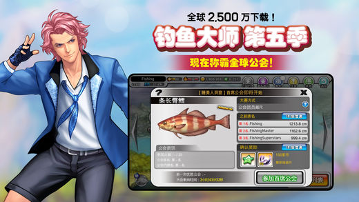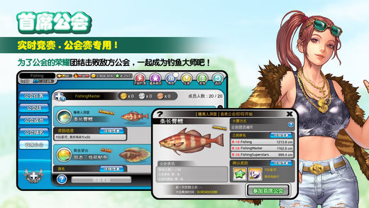 [全新第五季更新功能] * 为了公会的荣耀! 展开炙热的即时对战, 加入首席公会系统! - 新增所有公会可即时参加的 '公会专用大会'。 - 征服钓鱼场提升公会的名誉后, 获得丰沃奖励吧! * 挑战最强怪鱼! 钓鱼高手们的钓鱼大会, 冠军联盟! - 由最狂、最猛烈的鱼儿所集结而成的高等钓鱼大会! - 从为期一周的高手对决大会中胜出, 将可获得最特殊称号! * 从分解钓竿获得更棒的钓竿?! 新增装备分解 & 碎片合成系统! - 现在起分解不需要的装备, 制作更好的钓竿吧! - 以 '分解' 钓竿所获得的 '碎片'进行 '合成', 将可获得更好及稀有道具! [钓鱼大师的特色] * 与好友一起创建公会, 进行公会任务吧! - 公会创建、加入、管理、退出等公会功能加入 - 一起完成公会任务获得特殊奖励! * 最火热的 1:1 对战模式!! 与其他玩家来一场痛快的钓鱼比赛吧! 争取联赛排行,获得特殊奖励! * 协助你的钓鱼佣兵!! - 只要雇用钓鱼佣兵,即使不登入也会帮你钓鱼喔! - 派遣你的佣兵获得更多的奖励吧! * 抛开那些没有卷线乐趣的钓鱼游戏吧! - 随时随地体验鱼儿上钩的乐趣! - 体验真正的钓鱼乐趣! * 以各式鱼饵让各种鱼而上钩吧! -抛竿、拉竿、收线一应俱全的钓鱼魅力! -从小鱼到怪物级的古代鱼类! 缤纷多样的鱼类等你挑战! * 竞争与对决 ! -每天举办的钓鱼大会! 成为钓鱼王吧~ -在脸书炫耀与好友对决的大鱼吧! * 激发你收集本能的缤纷多样的鱼类~! -带你认识 500多种鱼类! -完成各式图鉴获得丰沃礼物! * 双倍的视觉飨宴! -在我的水族箱饲养你所钓来的宝贝鱼儿! -除了钓鱼乐趣,更给你各种秀丽景观大自然钓场! ___________________________________________________________________ 微博: http://weibo.com/FishingSuperstars ___________________________________________________________________ ** 此游戏支持中文简体 ** 游戏里的部份道具需要储值购买, 而且依照商品种类, 可能会有额外的费用 使用条款 : http://terms.withhive.com/terms/policy/view/M61 个人信息保护政策 : http://terms.withhive.com/terms/policy/view/M61