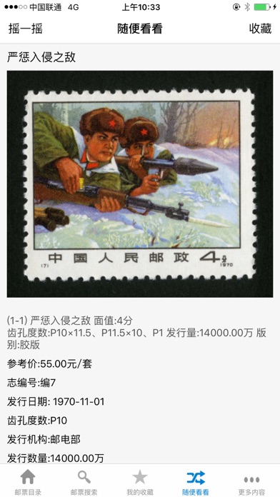 APP Store 收录最全、图片最多邮票目录应用,一共收录了从清代中国发行的第一套邮票到2015年的所有邮票,每套邮票均配有清晰大图,每枚邮票均有清晰图片显示。 收录的邮票目录包括: 纪字头邮票、特字头邮票、文字头邮票、T字头特种邮票,J字头纪念邮票,编年邮票(1992-2015). 收录的清代邮票及解放前邮票目录包括: 1878-1912年清代邮票,1912-1949民国,解放区邮票。包括土地革命战争时期邮票、抗日战争时期邮票、解放战争时期邮票。 另包还收录了包括编号邮票、欠资邮票、航空邮票、军用邮票等发行量不多的小众邮票目录。 关于邮票图片: 邮票图片无疑是最重要的,此版本收录的邮票图片包含每套邮票的整套图片以及每套邮票包含的每格邮票的单独高清图片。 对于专业邮票收藏人士,还提供了邮票的详细说明,包括: 志编号、设计者、全套枚数、整版枚数、类别、题材、摄影者、发行机构、发行量、背胶、印刷机构、齿孔度数、版别及市场估价。 使用者可以在分类及整个目录按照发行日期或市场参考价排序,对于喜欢的邮票,可以加入收藏夹方便随时查看。 使用者也可以根据名称、志编号、搜索邮票,准确且快速。