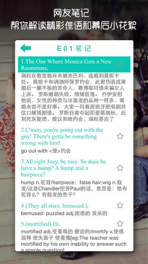 老友记,几乎成为英语学习的必须推荐,也被奉为无法复制的美剧经典。 从现在开始,我们就可以随时随地带着它,在公交上,地铁上,马桶上,睡觉前…… *坚持背完一季剧本,挥手告别字幕时代。~ *坚持背完两季剧本,与外国友人交流So easy~ *坚持背完三季剧本,可获得与外国偶像共进晚餐奖励一次……才怪 (ー∀ー) 以此类推 注意:个别用户无法下载是由于系统时间设置问题,请在设置-通用-日期与时间-选择自动设置 即可。 ——————1.3.1版本新增功能—————— 1.视频功能重新回归。喂!不要捧着手机在那傻乐啊。(视频来源搜狐,不支持下载) 2.字体大小调节功能。提供给您更舒适的阅读体验~ 3…