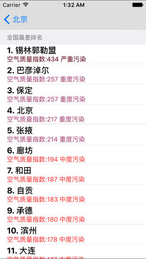 想实时了解您所在城市的空气质量吗?想知道实时AQI指数和PM2.5值是多少吗?使用此应用,你可快速了解全国286个城市的空气质量指数,帮助安排出行和活动计划。 >>>>相关科普 AQI AQI,即空气质量指数(Air Quality Index),AQI分级计算参考的标准是新的环境空气质量标准(GB3095-2012),参与评价的污染物为SO2、NO2、PM10、 PM2.5、O3、CO等六项,因此AQI较API监测的污染物指标更多,其评价结果更加客观。 AQI的数值越大、级别和类别越高、表征颜色越深,说明空气污染状况越严重,对人 体的健康危害也就越大。看AQI时,不需要记住AQI的具体…