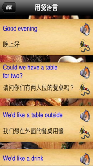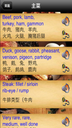 你在学英语吗?如果你能自如地听懂人们的谈话并给予回应,那么在英国酒吧和餐馆用餐将是一件充满乐趣的事。 英国菜单能帮助你练习你将听到或需要说的词句。你可以收听实用句型、词组和词汇的音频。你可以阅读英国菜单上特色菜的具体描述。你也可以录下自己的声音,并将你的发音与英国人的英语发音做比较。 适合中级英语学习者。 本应用程序也是教师的实用参考资料。 英国菜单分为以下类别: 饮料 开胃菜和汤品 鱼类和海鲜 主菜 蔬菜 香草和调料 奶酪 甜点 水果 英国葡萄酒 英国生啤酒