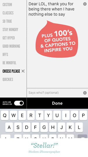 You've found the authentic Word Swag™ app! Word Swag easily and magically turns your words into beautiful photo text designs. "It's like having a graphic designer in your pocket" -MoCoLoco "Express emotions and ideas with artistic elegance" -AppAdvice "Stellar" -Modern iPhoneographer Create amazin…