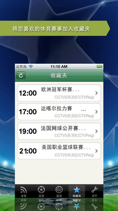 重大赛事精彩不容错过!预告本月内全球各类体育赛事以及电视直播等实用信息的体育类客户端, 内容覆盖欧洲五大联赛、欧冠,NBA,NFL,MLB,F1,奥运,中超,CBA等等全球各大重点体育赛事, 同时提供便捷的赛事订阅提醒功能, 避免错失每场重要的比赛, 是广大体育迷的必备工具。 体育赛事指南为您全方位的呈现各种最新,最劲爆的体育赛事以及它们的播放时刻表。 您可以锁定您喜爱的体育赛事,设定提醒时间,也可以按照您喜爱的类别,从足球,篮球,网球,棒球,高尔夫等20多个项目中选取,也可以输入简单文字进行模糊查询,把您喜欢的赛事加入收藏夹,随时提醒您准时收看 功能特点: ------------ 闹钟提醒功能 汇集全球各种重大体育赛事播放时刻表 按分类查看或者快速搜索您需要的体育赛事 微博上传,写下您对比赛的看法,与朋友们分享吧 新增收藏夹功能 如果你是个体育迷,那么体育赛事指南将是您最好的助手。它将为辛勤工作、日理万机的您安排好看体育赛事的时间,不让您错过任何一场精彩赛事。 本App是一个体育导航,所有直播和视频链接均由网友提供,并链接到其他网站播放,如有异议请与我们取得联系