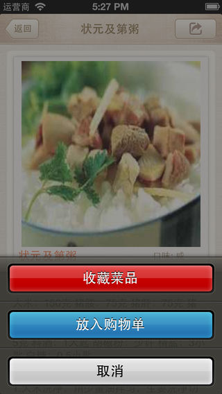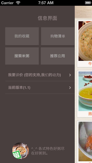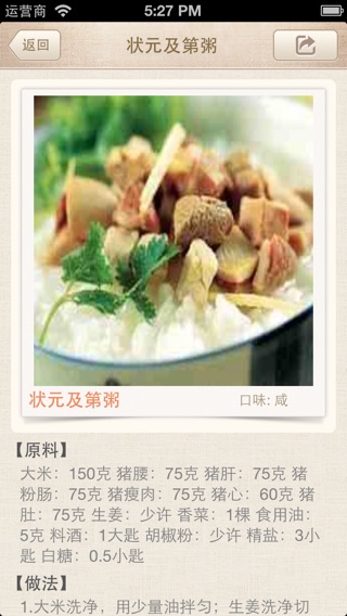 粥也称糜,是一种把稻米、小米或玉米等粮食煮成的稠糊的食物.是我们主要的佐餐食品,尤其以早饭为主。一碗粥下肚,开胃健脾、有益身心。 应用程序简介: 1.各色米粥任您选择,包含各地经典特色好粥。 2.完美支持iphone5,兼容更多设备。 3.支持全文检索、关键字查询。 4.购物单菜谱收藏功能,方便您及时调出购物信息。 5.优美合理的布局界面,效率护眼。 6.信息本地储存无需连接网络。 我们将不断更新数据,升级版本。谢谢您的支持和鼓励...