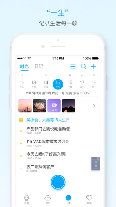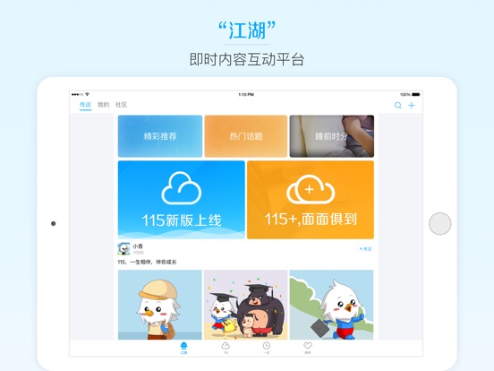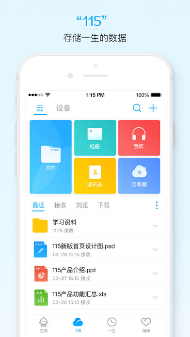 115是国内最早一批上线的云存储产品,致力于为用户提供安全稳定的个人数据存储工具,并在云存储的基础上扩展出“发现”、“一生”和“相伴”几大产品模块,发展为一款功能强大、能陪伴用户所有生命周期的云应用。 发现”频道打造了一个即时的信息互动平台,为用户提供多元的信息展现方式,包括“江湖”和“社区”两大主要模块; “115”是个人数据中心,致力于为用户提供一个私密的云端存储空间,让你把一生中的文件、照片、通讯录等通通搬到云端; “一生”频道是用户生命痕迹的记录仪,帮助用户记录并管理一生中最重要的资产:时间、财富和健康; “相伴”频道提供了丰富的增值服务,帮用户更好地管理自己的数据资产,获得更多娱乐体验,还提供求职招聘的便捷渠道。