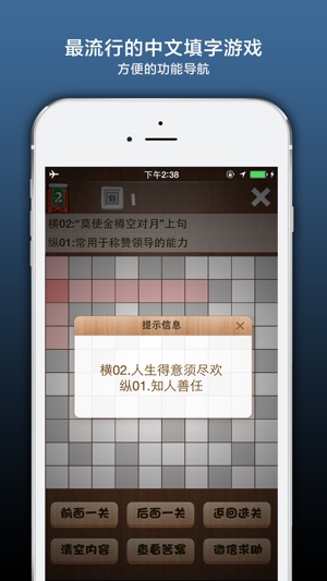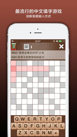 2012年最疯狂的填字游戏!你还在等什么! 创新填字玩法挑战你的脑细胞,现在就来下载! 一键求助微信朋友圈,时下最疯狂的社交游戏! 疯狂填字是最早的在线中文填字游戏,现在你可以在手机上玩填字了,既打发了时间,又增长了知识,你准备好挑战史上最疯狂的中文填字游戏了吗? 1、游戏一开始只有几道题可以选择 2、游戏时请选中空格查看提示 3、点击字母按键输入首字母拼音 4、正确完成词条就会转换为汉字显示 5、点击+号弹出功能菜单 6、完成题目80%解锁下一题 7、完成100%可以解锁答案,而且再奖励解锁一题 8、完成或购买道具解锁后可以双击查看答案 帮助中心还可以 1、切换音效…