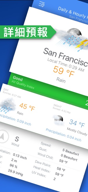 随时了解并发现天气动态。 您可以查看当前天气的详细情况,也可以追踪一小时后乃至近10天内的天气动态……随时掌握天气情报! 这款应用让您避免在暴风雨中野餐,或者帮助您在进行常规户外锻炼时避开大雨,以免淋湿着凉。 有了天气雷达,您可以时刻关注每分钟的天气变化,避免措手不及的尴尬情形。 现在,您可以参考空气质量指数,在空气污染水平最低的时段安排户外活动。 您爱用天气雷达的原因 • 实时降雨和降雪雷达 • 追踪飓风 • 极端天气预警 • 空气质量指数 • 地图警告(洪水和飓风) • 分日与分时天气预报 • 图表:温度、降水、风、气压和紫外线指数 • 视觉效果精美直观 天气预警* 及时了解极端天气…