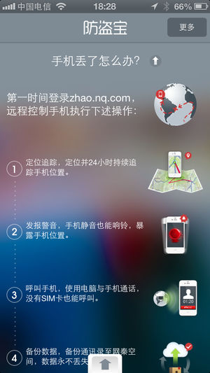 网秦防盗宝 防盗宝帮您找回丢失的手机,保护您的隐私! 您还为丢手机而担心么? 防盗宝为您解决困扰! 防盗宝为用户提供有效的解决方案,帮助他们找到丢失的手机并保护隐私。防盗宝可以定位&追踪手机,给手机发屏幕信息,更能打网络电话到丢失手机,即使手机没有SIM卡也可以操作,除此之外,还能网络备份通讯录(zhao.nq.com),防止联系人信息丢失。今天就安装防盗宝吧,让您的手机时刻受到保护。 防盗宝功能 >远程定位 >远程呼叫 >24小时轨迹追踪 >通讯录备份 >发报警音 >发屏幕消息 防盗宝能做什么? 情景1:发现手机被盗。 防盗宝可以帮助—— 用户定位手机,并帮助警察寻找被盗手机。…