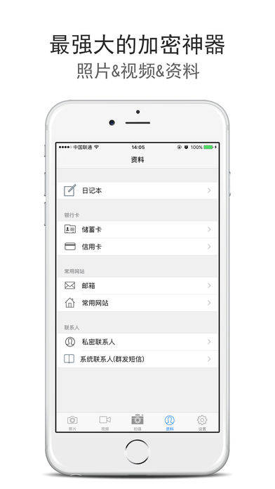 史上最好用, 最强大的隐私保护App,为您加密存储照片、视频、账号、日记、联系人。 加密相册是怎么运作的? 第一, 作为一款保密应用, 您最关心的应该就是安全问题了, 加密相册提供多重保护机制, 确保您的秘密安全存储: √ 支持登陆密码——需要登录密码才能访问应用内数据 √ 支持文件夹密码——每个文件夹都可以单独加锁 √ 支持伪装密码——输入伪装密码时,只显示一些无关紧要的照片和视频 第二, 作为一款人人称道的好工具,怎么能处处设限、收费? √ 无限存储:无数量、无容量限制,想存多少就存多少 √ 完全免费:无任何功能限制,尽情享受所有的贴心设计 第三, 作为一款功能强大的隐私保护工具, 加密相册还有许多您意想不到的特色功能: √ 支持加密存储:照片、视频、账号、日记、联系人 √ 支持iTunes/Wifi批量导入导出照片/视频 √ 支持通过Email发送加密照片pdf √ 支持分享照片到社交网站:微博、微信、facebook、twitter 您还在等什么? 只要下载即可拥有如此强大、功能丰富的免费加密App, 从此不再惧怕隐私照片、视频、账号、日记、联系人被其他人看见了! ______________________________________________________________________________________ 如果您有什么建议,请联系:wangping_app@sina.com或qq:673368731.官方技术支持qq群:331210536