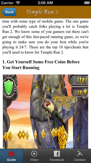 this a guide application containing: Cheats, Tips, Guides, Strategies, Boosts, Daily Spins, Multiplier Guide and more for Temple Run 2 (Including the Facebook version) DOWENLOAD NOW!! this *COMPLETE* Guide have -Introduction to the game -Tips & Tricks -Strategy Guide -Secrets -Cheats & Codes -Walkthrough Guide -& MORE! DISCLAIMER: ------------ This guide is unofficial. No one has endorsed, promoted, or warranted the accuracy or quality of the products or services offered in this guide.