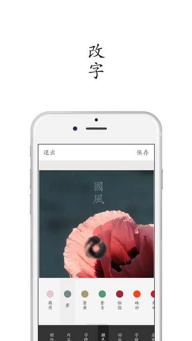 「字拍 - 国风」篇,是一款专注于把传统中文字形添加到图片上的 App。包括内敛形迹的宋体,可爱风的剪纸体,挺秀均匀、文质彬彬的书刻体,行云流水般的行书,飞扬恣意的草书等多种字体。更有160种东方传统颜色,还有大量丰富的贴纸资源,包括泼墨、剪纸等。 您也可以在 App Store 搜索「字拍」获取免费的普通版,是专注于快速添加现代风格字体的加字美图 App,没有广告。 操作简洁迅速,编辑文字轻松容易。字拍专注的,是让你更方便地用美丽的中文去展示图片的美。 #值得注意的# - 高质量的成像,原图编辑 - 内置160种东方传统颜色 - 调节文字字号大小 - 调节文字透明度 - 调节文字阴影水平、竖直方向大小,阴影颜色 - 调节文字的渐变颜色 - 任意移动文字 - 竖排或横排的文字样式