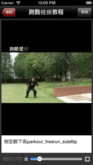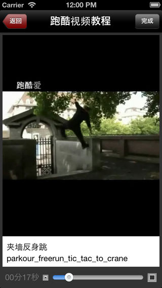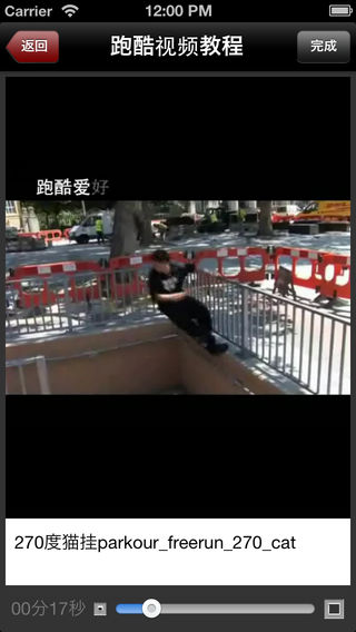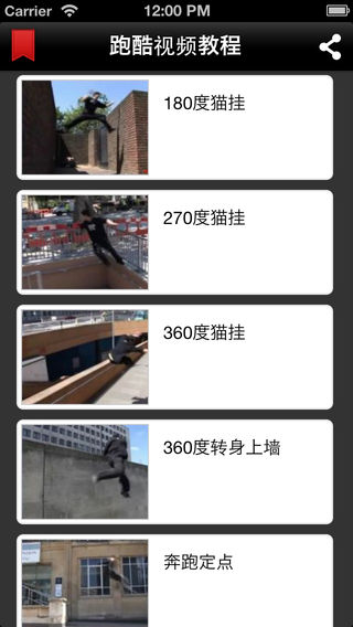 跑酷是一项非常具有观赏性的城市疾走、街头疾走极限运动,是一种需要真正勇士精神的运动。 喜欢跑酷的人越来越多,爱好极限运动的您,是否也想像猿猴一样的极速灵活攀越? 跑酷视频教程应用为跑酷(Parkour)爱好者提供经典的入门视频教程,让你轻松入门跑酷运动! ***温馨提示:跑酷视频部分危险动作,请勿直接模仿,应循序渐近学习!*** 跑酷视频教程提纲: 001 180度猫挂_parkour_freerun_180_cat 002 270度猫挂parkour_freerun_270_cat 003 360度猫挂parkour_freerun_360_cat 004 360度转身上墙parkour_freerun_360_wall_hop 005 奔跑定点parkour_freerun_running_precision 006 奔跑猫挂上墙parkour_freerun_running_cat 007 侧空翻下高parkour_freerun_sideflip 008 撑跳屁蹲parkour_freerun_kash_vault 009 单脚定点parkour_freerun_precision_one_foot_take_off 010 荡杆parkour_freerun_lache 011 倒立parkour_freerun_hand_stand 012 登墙穿越parkour_freerun_tic_tac 013 登墙定点parkour_freerun_tic_tac_to_precision 014 登墙猫挂parkour_freerun_tic_tac_to_cat 015 定点猫挂上墙parkour_freerun_cat_level_to_level 016 定点跳parkpour_freerun_precision_2_footed_takeoff 017 反身猫挂parkour_freerun_turn_vault 018 杆上猫爬parkour_freerun_cat_balance 019 高处猫挂上墙parkour_freerun_catleap 020 后空翻parkour_freerun_backflip 021 换手懒人跳parkour_freerun_lazy_vault 022 夹墙parkour_freerun_crane 023 夹墙反身跳parkour_freerun_tic_tac_to_crane 024 金刚跳parkour_freerun_diving_kong 025 金刚跳穿越parkour_freerun_kong_vault 026 金刚跳定点parkour_freerun_kong_precision 027 金刚跳接猫挂parkour_freerun_kong_cat 028 落地滚翻parkour_freerun_rolling 029 屁蹲穿越parkour_freerun_dash_vault 030 平衡走栏杆parkour_freerun_balance 031 上高墙parkour_freerun_wall_run 032 上墙猩猩跳parkour_freerun_wall_hop 033 双金刚跳parkour_freerun_double_kong 034 双手反身跳parkour_freerun_reverse_vault 035 顺风旗撑杆parkour_freerun_flag 036 速过parkour_freerun_speed_vault 037 下高缓冲parkour_freerun_landing 038 鱼跃滚翻parkour_freerun_swan_dive 039 月亮步parkour_freerun_moonstep 040 直腿侧空翻parkour_freerun_aerial 041 转杆parkour_freerun_palmspin 042 转墙parkour_freerun_wall_spin 043 转身下高parkour_freerun_dismount 044 钻杆parkour_freerun_underbar
