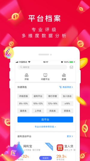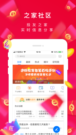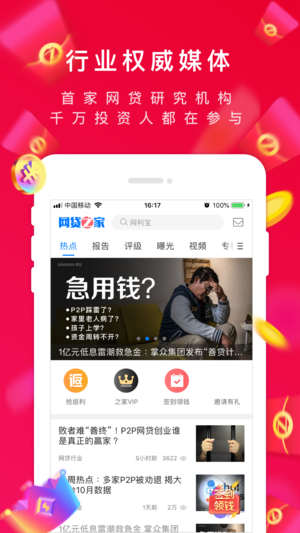 【公司介绍】 网贷之家是中国访问量最大、影响力最大的P2P理财投资门户网站! 网贷之家提供专业的新闻资讯、档案评级、数据报告、理财社区等。 网贷之家用户超800万,手机理财投资就上网贷之家! 【APP介绍】 五大功能页,专属个人中心,网贷之家是您的贴心理财助手。 【资讯】:网贷界的今日头条 最前沿的新闻资讯一网打尽,让您快速掌握P2P动态。 采用图文并茂、视频直播的方式让您轻松看网贷! 【平台】:评级档案一键查找,便捷省心 选背景,选利率,选期限,总有一款产品适合您! 网贷之家基于大数据技术建立各类网贷平台的多维度量化评估模型,旨在帮助投资人能更安全地投资。…