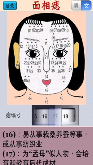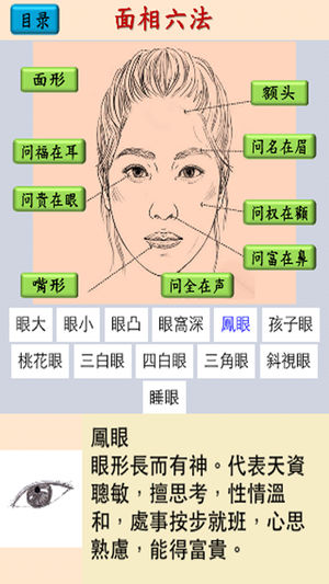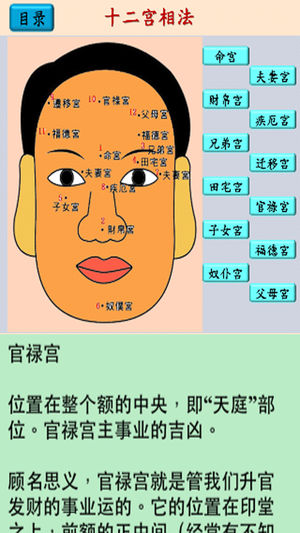 "面相图解" 收集了面相学的一些基本资料, 以图解的触控方式浏览, 很方便参考. 内容分为 4 个部分: 1. 面相六法 2. 十二宫相法 3. 三停流年法 4. 面相痣 再加上 "设定" 可以选择: 1. 中文简繁体 2. 页面字体大小 3. 页面背景及字体颜色