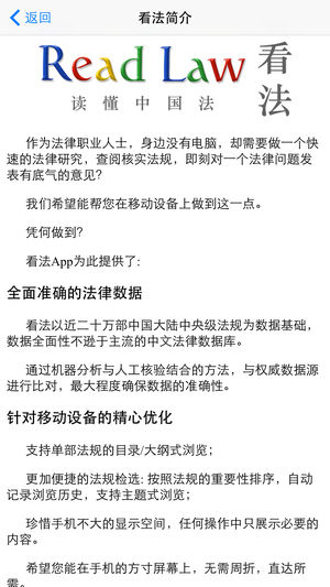 看法不仅仅是一个移动的法规汇编和法规查阅工具,而且是一个全功能的移动法律数据库,未来甚至会成为一个移动的法律垂直搜索引擎。 作为法律职业人士,身边没有电脑,却需要做一个快速的法律研究,查阅核实法规,即刻对一个法律问题发表有底气的意见? 我们希望能帮您在移动设备上做到这一点。 凭何做到? 看法App为此提供了: 全面准确的法律数据 看法以近二十万部中国大陆中央级法规为数据基础,数据全面性不逊于主流的中文法律数据库。 通过机器分析与人工核验结合的方法,与权威数据源进行比对,最大程度确保数据的准确性。 针对移动设备的精心优化 支持单部法规的目录/大纲式浏览; 更加便捷的法规…