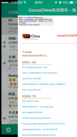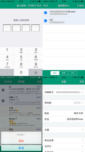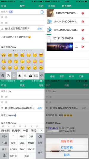 139邮箱客户端,功能强大,界面美观,操作简单 特色功能 1.手机联系人,最近联系人,写邮件时可以直接选取 2.友好的联系人输入栏。 3.批量对邮件进行标记,删除等操作。 4.邮件详细页支持Html邮件,支持缩放, 5.支持jpg,png,txt,word,ppt,excel,rar,zip等各种附件的查看,下载,保存与收藏。 6.支持发送图片,文档等带附件的邮件。 7.密码锁保护邮箱内容。 8.草稿箱,支持邮件的本地保存,在没有网络的情况下也可以进行编辑。