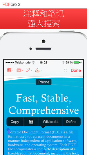 *** 重要:如果你在运行iOS 9 或更新版,请勿下载此版本。请下载PDF Pro 3。 *** PDF Pro 2让你直接在iPhone和iPad上阅读、编辑和注释PDF文档。突出显示文本、记笔记、嵌入形状或用指尖绘图。你甚至可以嵌入录音或照片注释。在你的整个PDF库中搜索文本。 尤其是所有PDF Pro 2拥有全功能PDF格式并支持签名。 功能概览: • 注释和笔记: ∙ 突出显示文本、用指尖记笔记或绘图。 ∙ 强大的形状(箭头、矩形、圆形等)编辑器。 ∙ 向PDF文档嵌入音频和照片注释。 ∙ 使用预先界定的图章或创建个人图章。 • 强大搜索: ∙ 在整个PDF库中全面搜索文本。…