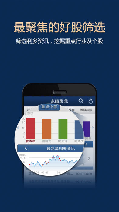 一财点睛是全国首创的资讯决策软件,专家为你筛选“会上涨”的好资讯。由国内知名证券软件益盟操盘手携手第一财经联合推出。凭借第一财经强大金融媒体实力,开创了信息直达式的速递,帮您跳过传统资讯漫长发布流程,一步直达个人投资者,这是深加工资讯首次面向个人。同时,融合益盟操盘手经典的BS点,解决买卖决策问题,帮助投资者把握市场主题投资机会和个股趋势波段操作,实现投资获利。 最深度的专家解读,与机构视角同步 股市中的消息鱼龙混杂,一财点睛并不是简单的资讯堆砌,而是对全市场资讯进行筛选、深加工,并予以深入透彻的原创点评,去伪存真汇集高含金量资讯。再从上市公司业绩、公告新闻、行业政策、重大事件着手,深度解读并分析潜在影响,帮助普通投资者从机构的视角,锁定股价上涨的原始驱动力,发掘资讯背后的“金矿“。 最聚焦的好股筛选,挖掘重点行业及个股 市场上的资讯多如牛毛,筛选起来耗时耗力。一财点睛筛选出利多资讯最聚焦的行业及个股,图形化直观展现热点行业及重点个股,一目了然。同时,结合“中线掘金““周期共振”战法精挑细选出有操作价值的优质个股,与机构选股思路同步。一财消息面,结合益盟核心算法双重选股条件,为投资筛选出最具上涨潜力的个股。 最可靠的资讯来源,一财400余名记者团深入调研 市场中的消息真假难辨,一财点睛依靠第一财经遍布全国的400余名记者团,深入到政策、机构决策层与上市公司高管,对重大事件、焦点人物进行专题采访报道,亲临上市公司调研并做跟踪报道,报道面涵盖各大财经热点,结合益盟操盘手的技术面优势,一财点睛确保财经资讯的真实、快速,并直接聚焦投资机会。 最智能的买卖提示,波段操作持久获利 不是所有的资讯个股都具有操作价值,还要看合适的介入时机,并懂得止盈止损。操盘线BS点买卖信号,智能判断个股趋势变化,大波段绝不错过,适时告诉你止盈止损点,长期大概率波段获利。 “会上涨“的资讯表现: 10月表现:一财点睛提及个股278只,其中上涨个股155只,上涨占比65.20%,平均涨幅14.07% 9月表现:一财点睛提及个股300只,其中上涨个股155只,上涨占比64.05%,平均涨幅14.62% 明星个股:中青宝 报道时间:5月8日08:35 报道内容:网游市场后年将超千亿,布局龙头企业(中青宝、掌趣科技等)。 实战操作:操盘线周线5月10日发出B点买入信号,10月18日发出S点卖出信号 收益结果:期间收益达339.5% 股市,是一个“有经验的人获取资金,有资金的人获取经验”的地方。在股票市场,每个人都是永远的学生,投资的路上,我们比肩同行,不断探索不断进步。 客服热线:4006709090 官方网站yicai.emoney.cn 官方微博:新浪@一财点睛