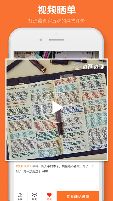 边逛边聊,视频晒单、聊天的购物平台。 在这里,你可以: 买过的商品怎么样?用视频来评价; 买过的人都在这里,随手一问去聊聊。 在这里,我们想要: 打造最真实的购物体验分享,给你生动的商品推荐。 视频晒单——打造最真实直观的购物评价 和买过的人聊天——买东西前,随手一问 跟小伙伴一道血拼——搜搜关键词就能找到同兴趣的群 死抠小编精选——全网每天给你搜罗最新特价商品 【联系我们】 微信公众号:「Wave边逛边聊」 欢迎前往我们用心架的另一座桥梁。
