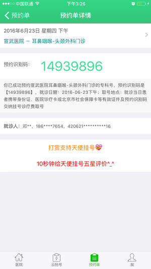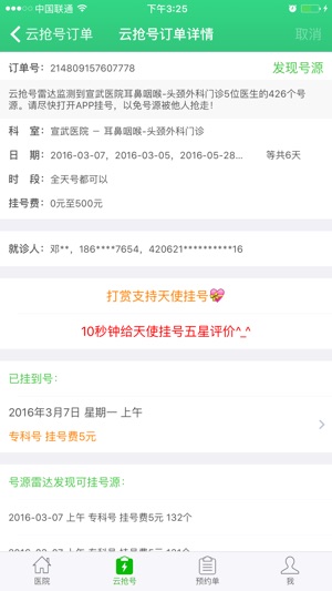 天使挂号,有温度的挂号好帮手,独有『云抢号』功能,是挂热门号源的大杀器,像抢火车票一样抢号。免费好用,1,000,000人正在使用天使挂号。 天使挂号目前支持北京、天津、浙江等省市的在线预约挂号,未来将面向全国,支持更多的医院挂号。下载、使用全免费哦! 从此不用守着电脑挂号啦! 再也不需要4点就起床在医院排队挂号啦! 更不需要花大把大把的银子从各路“神仙”手里买号啦! 【免费易用】免费、易用、简单、全自动挂号 【移动挂号】随时随地查看号源,随时随地挂号。轻点手指,号源到手。 【云抢号 - 自动抢号】放号第一时间在云端为你自动抢号,再热门的号源不过如此简单 【云抢号 - 号源雷达】号挂满了…
