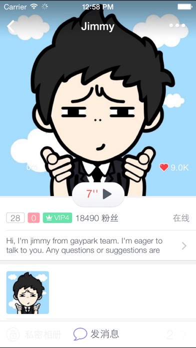 『无广告啊!!! 而且还有免费密码锁啊,亲,快和小伙伴来一起用吧』 同志公园GayPark GPark是亚洲最炙手可热的同志交友应用。一推出即在亚洲掀起小风暴,在泰国社交排名一度排名第一。台湾, 韩国, 日本, 老挝好评如潮。在美国以及全世界,被评为最受欢迎的亚洲裔同志社交应用。快和你附近的好基友聊天,约会,交友吧。数以百万的基友正在使用GayPark同志公园, 爱情触手可及! 你应该选择GayPark同志公园: · 系统运行快速,流畅, 功能强大 · 简简单单通过标签就能找到相似兴趣的人 · 更及时的通知系统,让你不错过擦身而过的缘分 · 高级条件搜索,精准查找你的意中人 · 更多的基友在你的附近 还有更多: GayPark会根据你的位置,帮助你搜索到附近的好基友。提供地图查看方式,直观明了对方的位置。 在GayPark上聊天和约会非常方便容易, GayPark提供强大的聊天功能,包括图片,语音和丰富的表情。 提供大容量个人相册。你可以在个人页展示你的风采。 同时可以上传私密照片,只分享给你的好友。 提供根据标签搜索用户等, 根据你感兴趣的标签,你会发现更多与你品味一样的同志。同时,使用标签,你会获得更多曝光,认识更多的好基友。 通过查找附近在线同志,让你和他更快速接触。 500次回眸才换来今生的擦肩,GayPark不会让你错过千年修的的缘分。附近的新基友加入,你会收到及时的通知。 你还可以屏蔽不受欢迎的用户或骚扰用户,免受骚扰。同时保证你的隐私。 快加入同志公园。与他一起约会。 条款: - 尊重每一个会员 - 请勿上传任何黄色或非法暴力的图片,所有的图片必须是适合所有用户查看。 - 您必须年满18周岁或18周色以上才能注册GayPark - 违反我们的服务条款可能会导致您的内容或您的帐户被删除! - 我们的应用程序商店提供的政策,所有的应用内购买协议是最终的。 官网地址:http://www.gaypark.us/ 微信:gay_park 邮箱: jimmy@gaypark.us