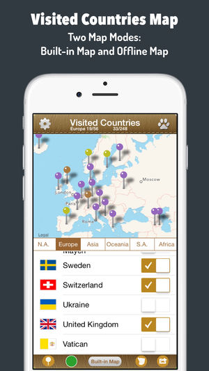 功能最强最全的足迹地图!!! 这是一个非常有趣的,全球55个国家的Top10旅行应用。该应用可帮助你创建个性化的到访地图。如果你去过很多国家的话,快快制作一个专属的世界地图向好友炫耀吧。 -------------------------- 1. 全世界近200多个国家或地区供选择,国家已按大洲分好类,方便勾选去过的国家; 2. 可修改足迹地图的颜色,可为不同的颜色做标注; 3. 地图可放大缩小。新版本增加了内置地图模式,地图比以前更为真实。点击底部的按钮“Built-in Map”即可进入该模式。内置地图模式提供了三种标记,可自由切换。 4. 足迹地图可以保存为图片,并通过微博,微信等分享给…