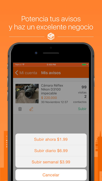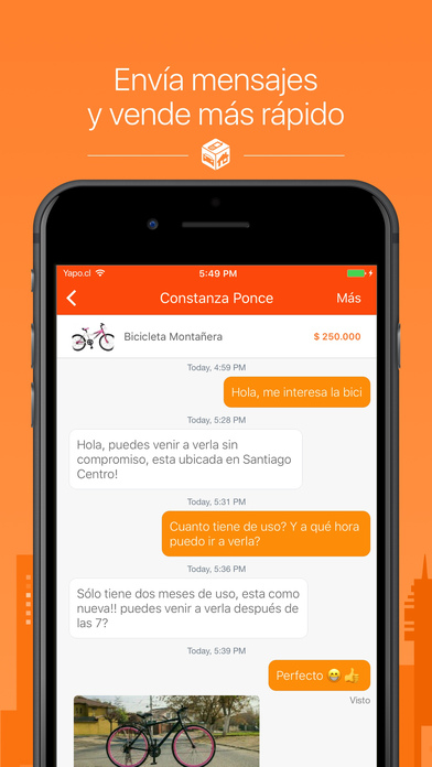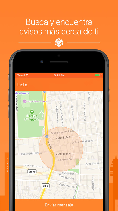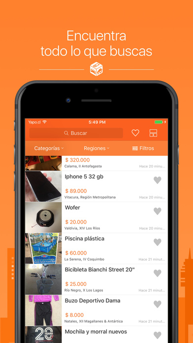 ¡Hola! Somos yapo.cl el sitio donde se venden más de 40.000 productos nuevos cada día. Publica GRÁTIS desde nuestra aplicación IOS, maneja tus avisos desde tu cuenta de usuario y logra hacer un excelente negocio. - ¿Que te falta? Encuentra todo lo que estás buscando entre más de 1 millón de avisos de inmobiliaria, autos, motos, empleos, hogar, electrónica, ocio y mucho más. - ¡No te pierdas! Los avisos ahora con mapa de ubicación. - Selecciona tu comuna y región, y accede a un mundo de avisos muy cerca de ti. - Compra directamente Subir ahora a tus avisos dentro de la app y potencia tus ventas. - Sácale brillo a tu celular agregando fácilmente fotografías desde la cámara y dale a tus avisos un look personalizado. - Accede rápidamente a todos tus avisos a través de tu cuenta de usuario, donde podrás además agregar favoritos y guardar tus búsquedas. - Comparte tus avisos con tus amigos en Facebook y logra vender antes.