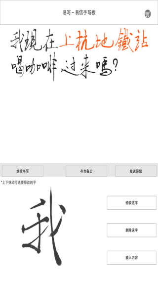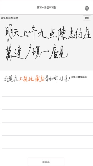易写-手写易信是专门用于手写易信的软件。写字可以让您的信息非常个性化,让对方看到你的手迹,使信息充满人性,而不再是冷冰冰的印刷体。 手写也是亲人朋友之间最好的沟通方式。 独特的手迹,防止别人借您名义盗发信息。 软件采用黑白图片,优化文字分辨率,压缩到普通照片容量的1/100,极省流量。 手写记事备忘的功能;并有定时提醒。 涂鸦功能; 适用于以下人群: 1)喜爱写字并乐于与亲人朋友写字沟通的人; 2)不会打拼音的人; 3)喜欢以手写记事备忘的人。 同时有手写记事备忘的小纸条功能;并能定时提醒。 为了节省流量,手写生成的图片已被压缩为黑白和低分辨率,以保证每张图在2K到10K以内,10M可以发1000条手写信息。因此,暂不支持用户修改背景,加入色彩等设置。