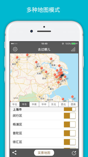 这是一个非常有趣的应用哦,可以生成个性化的到访地图。如果你去过中国很多省份和地区的话,快快制作一个专属中国地图向好友炫耀吧。 -------------------------- ------------ --------- 1. 可修改足迹地图的颜色; 2. 足迹地图可以保存为图片; 3. 统计去过省份和地区的数量; 4. 可以分享到微信朋友圈或其他社交网站; 5. 新增实景地图模式,提供更为真实的中国地图; 6. 在普通地图模式下,点击城市名可查看对应的百科介绍; 7. 在实景地图模式下,点击城市名可定位其在地图上的位置。 如有希望添加的其他功能,请在应用商店留言。