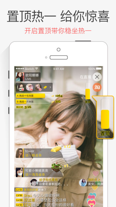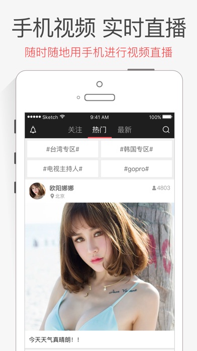 在直播是最火爆的真人视频直播App,让你随时能够用iPhone做视频直播。直播开始时,你的粉丝立刻会收到开播通知,一秒钟就能聚集大批观众。『在直播』集成了一系列社交功能,能实时看到观众的人来人往、疯狂点赞、弹幕。你还能收到来自观众的“金条”赞助! 其他功能: 【全球视频加速】视频服务器全球分布,保证视频流畅 【自动美颜】运用人脸识别,全自动实现美颜功能! 【赞助直播台】可以随时用钱投票,购置虚拟“金条”赞助直播台 【排行榜】根据人气每日更新直播台排名 开一个自己的直播台!