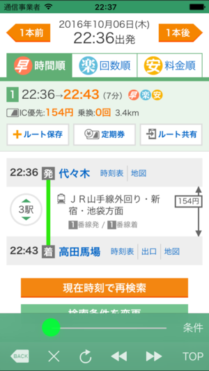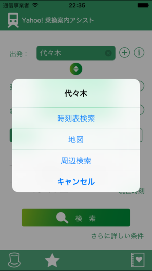 Yahoo!乗換案内サイトを利用するためのアシストアプリです。 このアプリでできること ----- ・前回の乗換案内の検索条件がデフォルト表示されます。 ・検索した駅は履歴に保存されます。 ・履歴から駅をお気に入り登録できます。 ・検索結果画面から新幹線や空路、歩く速度などの詳細条件もサクサク変更できます。 ・時刻表へのアクセスも簡単です。 ・現在地から駅までの地図を表示できます。 ・店舗検索アプリに連動して、駅周辺のカフェやファーストフードなどの検索ができます。 ※姉妹品「Mapカフェ とってもコンビニ!」のインストールが必要です。 ・iPhoneマップに連携して、 地図表示したり、現…