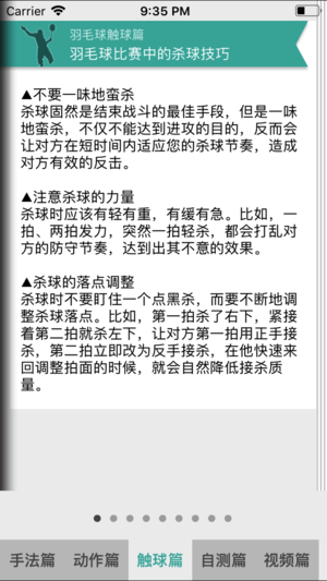 App Store中最据权威的羽毛球宝典。让你可以在短时间内从菜鸟到高手的必备神器。 速成:只要你对羽毛球有一点点兴趣,打开宝典看一看,分分钟让你成为羽毛球界中的“超级丹”! 易学:我不是一本枯燥的羽毛球教科书,用文字来阻碍你的行动,我是一个简简单单按照视频步骤动起来,就一定能够成功的宝典式App! 随时随地:利用你的任何时间,上班公交车,下班挤地铁,什么时候想看了拿出来看看,下次打羽毛球的时候照样做一做,你的朋友或队友就会明显感觉到你的水平在提升。 本App中还有世界羽毛球冠军林丹、李玲蔚等,诸多位羽毛球界明星手把手为您演示,让您深度了解羽毛球的各种打法。