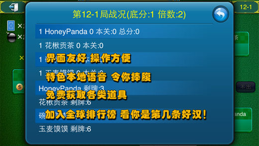 appstore上首个干瞪眼游戏,唯一支持3作为听用(配牌)的移动游戏!! 干瞪眼广泛流行于西南地区,规则特点是不能随便接上家的牌,只能用比上家大的那张牌接(2和炸弹除外)。如:上家出牌为5,你只能出6接,其他牌如7, 8, A均不符合规则,因此,常常出现拿一手好牌却无法出牌的尴尬场面,十分有趣,游戏也由此得名。, 本游戏采用了四川周边最流行的规则,除了大小王作为配牌外,还增加了3作为配牌,与大小王不同,3还可以单独出,这样游戏的变化更加丰富,让你玩起来爱不释手! 游戏以四川千年古镇文化为背景,穿插介绍各地的美食,让你在一边在享受玩牌乐趣的同时,还可一边欣赏古蜀风光。游戏一共十关,由浅入深,想一下通关可不容易。- 同时游戏还设定了积分英雄榜,你可以拿你的战绩在朋友们面前炫耀! 支持联网对战和苹果的GameCenter,可以在GameCenter中看到你的战绩和成就,甚至可以与你的朋友一起挑战游戏的关卡,看谁能获取更高的分数!