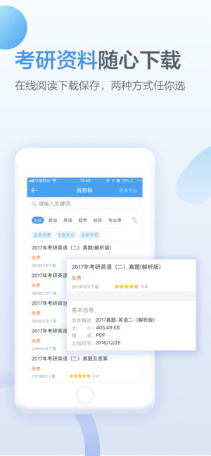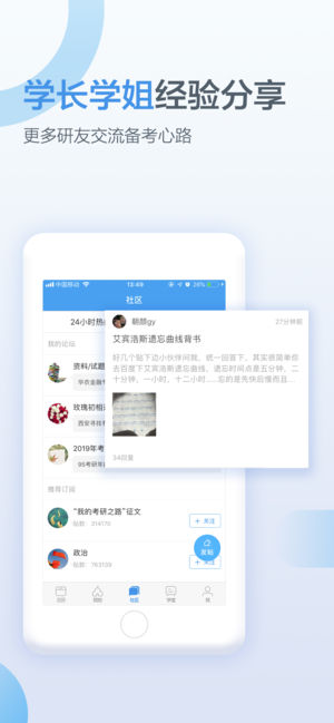 考研帮,让考研简单不孤单! 备受考研人欢迎、找资料、找信息、找学长、找研友一应俱全的考研备考软件。 每3个考研人有2个在用考研帮! 题库大改版,历年真题、模拟测验。 【考研帮能给你什么】 1、找信息——量身定制院校、专业信息 ◇你报考院校的报录比、分数线、导师信息、报考资讯、考试大纲一应俱全! ◇政策新闻信息实时更新,让你即时掌握一手考研资讯! 2、找资料——海量资料随心下载 ◇近10年公共课真题及解析、近800所院校专业课初复试真题、专业课课件等海量资料供你离线下载! ◇海量题库在线作答,答案解析详尽准确,复习效率更进一步 3、找学长——同校学长与你畅聊 ◇学长学姐与你分享考研经验,考神…