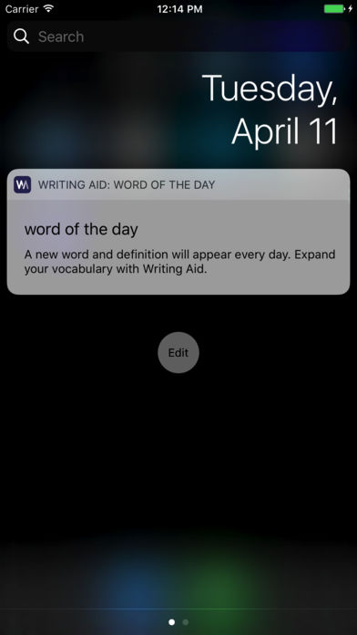 Writer’s block is a phenomenon that affects everyone. Know what you want to say but forgotten how to express it? Just can’t remember what this word means? Writing Aid can relieve this frustration. Instantly search for definitions and synonyms just like a standard dictionary. However, Writing Aid can also find words when you search for meanings. So a search for 'green blue color' returns suggestions like 'turquoise' or 'aquamarine'. Similarly, typing 'inventing new things' returns words such as 'candelabra' and 'sconce'. These words share the same meaning but make your writing more sophisticated and more elegant. You wouldn't want to write on your iPhone, but that doesn’t mean your iPhone can’t help you write. No ads. No fuss. Just the words. With iOS 8, Writing Aid can also be added to the Today view, as a Word of the Day widget. Be inspired every day with a new word to expand your vocabulary.