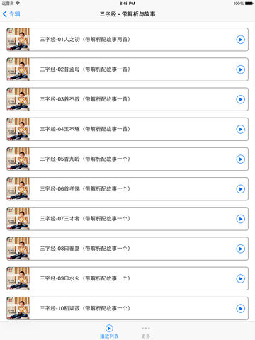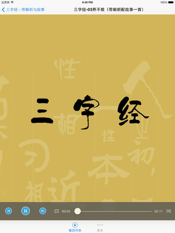 三字经弟子规有声朗读以及经典名句解释,边听边学好帮手。 软件体积较大, 请在wifi环境中下载安装, 一次下载, 后续无需再消耗网络流量! * 支持后台播放模式 * 支持顺序播放、随机播放等模式 * 支持定时休眠功能 睡觉前听也不用担心睡着的问题了 * 自动定位最近一次的播放记录, 省去查找的烦恼