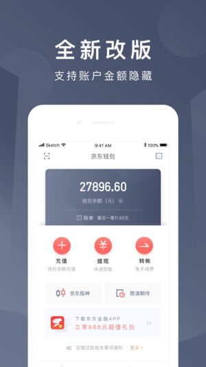 应用简介: 新版京东钱包对旧版庞大的体量进行精简,使其更符合定位。京东钱包不再承载生活服务类产品,这些服务将迁移至京东金融APP。当前,充值、提现、转账功能为京东钱包的核心功能。新版本还对界面风格重定义,使其更符合品牌文化,提升用户体验。 [主要功能] 提供钱包账户的充值、提现、转账服务,安全便捷。 加强实名认证力度,全方位保护您的帐户信息安全。 持续支持京东股神。 全新精简账单。 通知公告更醒目。 官方微信:京东钱包 客服电话:4000988500