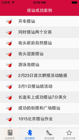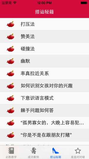 查岗 泡妞 约会 秘籍 > 必胜搭讪神器, 确保一招致胜! > 价值数千元的搭讪秘籍, 首次完整公开。 让您在数个小时内成为战无不胜的搭讪达人! > 您还在为不知道怎么追女孩子而烦恼? > 您还在为面对心仪的女孩却错失良机而烦恼? > 您还在为苦苦寻觅话题而烦恼? > 您还在为不知如何与她更进一步而烦恼? 搭讪必备素质 > 勇气:生活中,总有这样的情景,我们在城市的角落里遇到至少是外貌上让自己心动的女人。是怅然若失的擦肩而过,还是勇敢的走上前去,相信是很多男人都遇到过的问题。上或不上?上了该说什么?说了她会不会不理我?在你考虑这些问题的时候,或许你已经失去了和这个mm认识和交往的机会…