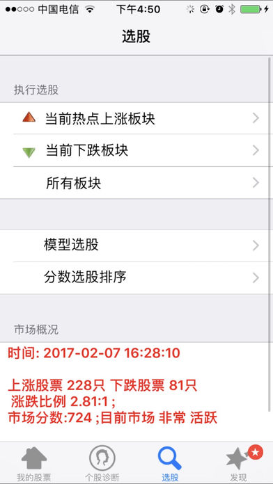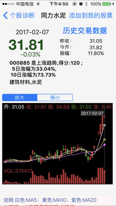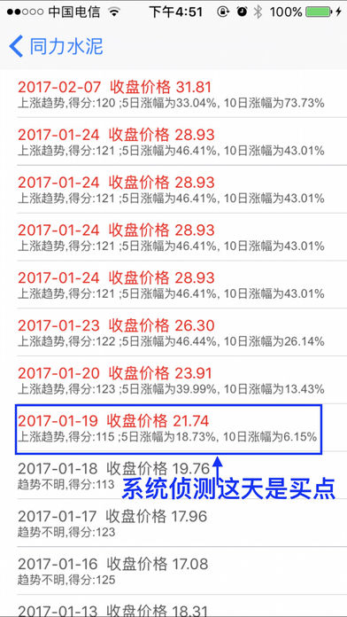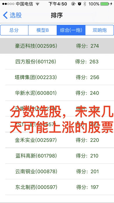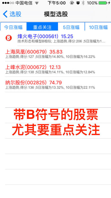 一只大黑马股票上涨一般要经过 以下五个步骤 1. 盘整 吸收筹码建仓; 2. 洗盘 洗掉浮筹; 3. 第一次突破上涨; 4. 再次洗盘回踩; 确定上涨无浮筹, 5. 主升浪来临,再次强势上涨。 我们把符合这类股票形态的称之为 双响炮 模型,双响炮就是寻找符合“ 洗盘结束时候,主升浪来临” 的股票形态。 软件每五分钟计算一次股市中所哟有的2700只股票,尽快找到符合主升浪形态的股票。 ------2015年 的双响炮 ,软件在当天提示--------------- 健康元, 3月17日 9块双响, 一个月涨幅1.5倍 中国南车/北车 3月26日 16块双响, 一个月 翻倍 中海集运 4月15日 6块双响 , 一个月 翻倍 中国一重 4月16日 7块双响 , 一个月 翻倍 悠久游戏 2月25日 9块双响, 一个月 翻倍 万马股份 5月7日 20块双响 一个月 翻倍 目前还在涨 赤峰黄金 4月14日 14块双响, 涨幅80%,目前还在涨 金丰投资 4月3日 20块突破, 一个月翻倍 。。。。。。。 ------------大家可以实盘可以看距离 5月25日----------------- 最近的一个双响炮模型 瑞贝卡 5月22日双响 9块双响,未来一个月涨幅????? ---------------------------------------------------------------- 双响炮出现最好在查看下股票基本面是否向好的方向改善(以下条件符合一个即可) 1.股票所属的行业大发展,爆发式增长 2.公司主要产品价格大幅增长 3.公司主要产品销量大幅增长 4.公司有新的产品上线,或者新产品研发成功 5.公司产生并购或者重组,价值重估。 软件主要依据史上最伟大的投机大师 杰西利佛摩尔的 “突破关键点” 和股市大师威廉欧奈尔的CAN SLIM 抽象出上涨模型B .股票在低位的上涨模型B是一种概率很高的上涨模型,是“翻倍股”的模型。“双响炮”就是模型B的一种特定走势 具体使用方式:选择“选股”模块 1.找出当下股市热点板块 2.找出每个板块中最强势的股票,然后找到板块领头羊 3.筛选找具有上涨形态好的的股票,具体可以找双响炮,低位模型B 4.查看基本面,看看是否可以支撑当前价位 C-A-N-S-L-I-M选股原则简述: C:最近季度的盈利比上年同期有大幅度的增长 A:年盈利增长率为25%—50%(要有稳定性和持续性) N:创新高的股票经常继续创新高 S:尽量选择小盘股 L:要买就买行业龙头 I:有实力机构参与易促进股价上升 M:大盘的趋势是个股走势的综合反映,是寻求大概率胜算的先决条件 软件还具有下跌预警、追踪最强板块、最强个股、和实盘演示的功能。 适用范围: 采用趋势交易和右侧交易法则的人群 ----------------------------- 如有问题请添加QQ:1780477985 微信号:yuchenStudios 邮箱:1780477985@qq.com 微博:http://weibo.com/FindMyStock -----------------------