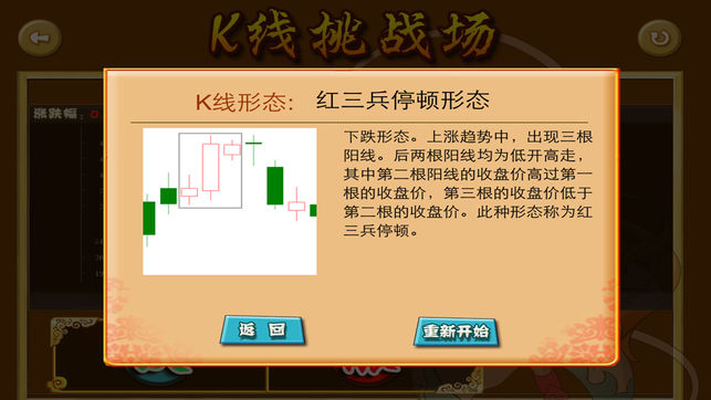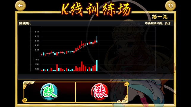 K线对于金融领域绝对是个经典符号,无论是股市,还是贵金属等,所以必须认识并理解K线。 K线训练营是一款绝无仅有的寓教于乐型K线游戏。训练营包括训练场跟竞技场,60根K线显示前30根,还有5日线,交易量,根据这些信息猜K线。 1.训练场属于通关模式,只有答对所有本关K线涨跌形态,才能打开下一关。本训练场内K线共有3000条,可以反复训练,K线随机出现; 2.竞技场属于挑战模式,选择的都是经典K线形态,答对10根以上就能显示K线形态名称以及介绍。竞技场里有经典K线2000条,可以反复使用; 3.纯知识,零广告;