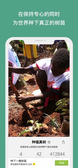 ## 113 国家中排名第一名的生产力工具 app;超过兩百万付费用户的专注神器; ## 简单有趣的方式帮助您保持专注,培养高效率的生活习惯 ## 我们的用户在世界各地种下超过 400,000 棵真树 纽约时报:“如果你想要放下手机、专注当下,真诚地和你的家人朋友们渡过相聚的时光,Forest 是你的最佳选择。” AppSo(爱范儿):“如果你决定放下电话,不再做手机奴了,那来专治多年低头族的 Forest 一定能帮助你,一起构建一座属于自己的森林吧。” 不论你是在图书馆读书或是在办公室上班,每当你希望有一段专心工作或学习的时间,你可以在 Forest 中种下一颗种子。在接下来的时间内,这…