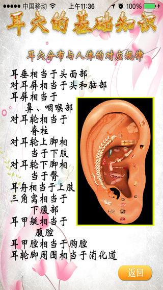 您仔细看过看自己的或别人的耳朵吗? 人的双耳并不平坦,象一个倒置的胎儿。耳廓上的每一条沟沟坎坎都有其特殊的耳穴定位意义,并有肢体和内脏的相应点存在其上,且按系统呈现一定的规律性。耳穴三角窝内为内生殖系统穴位的所在处,耳轮脚周围则分布着胃肠道系统的穴位。 从耳朵的形态和色泽可判断人们的身体状况,比如:耳朵大而厚者,体格健壮;耳朵小而薄者,瘦弱多病;耳朵红润者,面部气色亦好,精力充沛;耳朵萎黄,苍白多见于慢性消耗性疾病的晚期。 临床实践证明:耳穴诊治疾病,方法简单,直观、易懂、易学、易于掌握,特别是镇静、止痛、降压、清热泄火等,可达立竿见影的效果。 运用耳穴按摩方法进行人体保健由来已久,早在清代被誉为长寿皇帝的乾隆就将“耳常弹”作为自己保健的秘决之一,而耳穴按摩手法,无论哪个年龄层次,无论体强体弱,也不计较场合或时间,随意即可做起来,可谓方便、轻巧的举手之劳。 长年坚持耳穴按摩,可通过促进耳部血液循环,达到通经活络、调节机体阴阳平衡和增强机体免疫能力等。再加上耳部的一些具有特殊功效的穴位,如:内分泌、疲劳恢复点、便秘点、降压沟、神门等,可起到改善睡眠,增进食欲,大便通畅、平稳降压的效果,长此下去,自然会神清气爽,精力充沛,面色红润,耳聪目明,从根本上延缓了自身衰老。 本软件是在耳穴专家李家琪的指导下完成的,软件内容丰富,从穴位定位、解剖、应用、按摩、并配有耳穴视诊图谱、诊断图谱和治疗图谱,本套软件并且配有耳穴专家李家琪亲自编写的耳穴歌诀,让初学者好记好用。不仅让学习耳穴变得简单,而且能对耳穴水平有极大的提高。